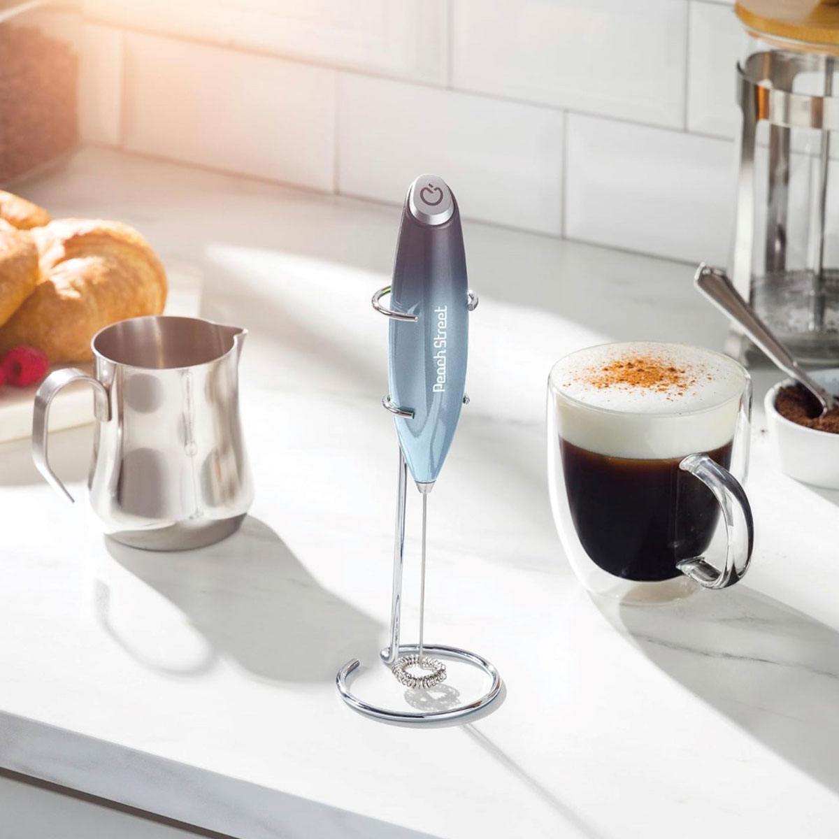 Sleek Design – Slender and sleek and a sophisticated appearance A sturdy metal stand lets the frother rest independent on a flat surface. The thin stem lets you froth in any size container or straight in the mug you will be drinking from!